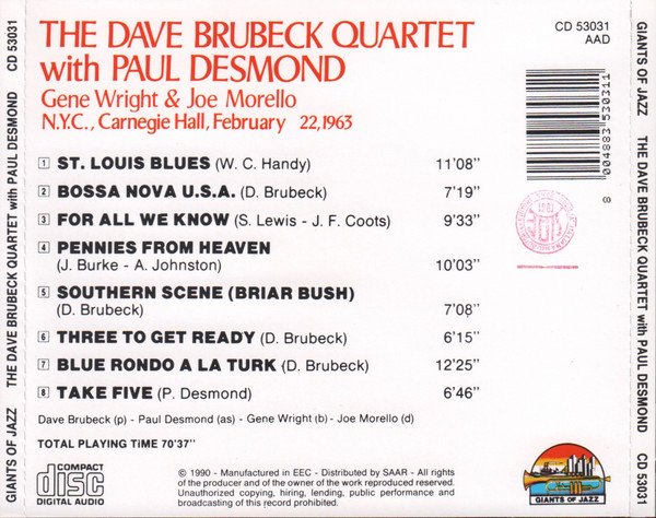The Dave Brubeck Quartet With Paul Desmond – N.Y.C., Carnegie Hall, February 22, 1963 (CD, Album, RE)